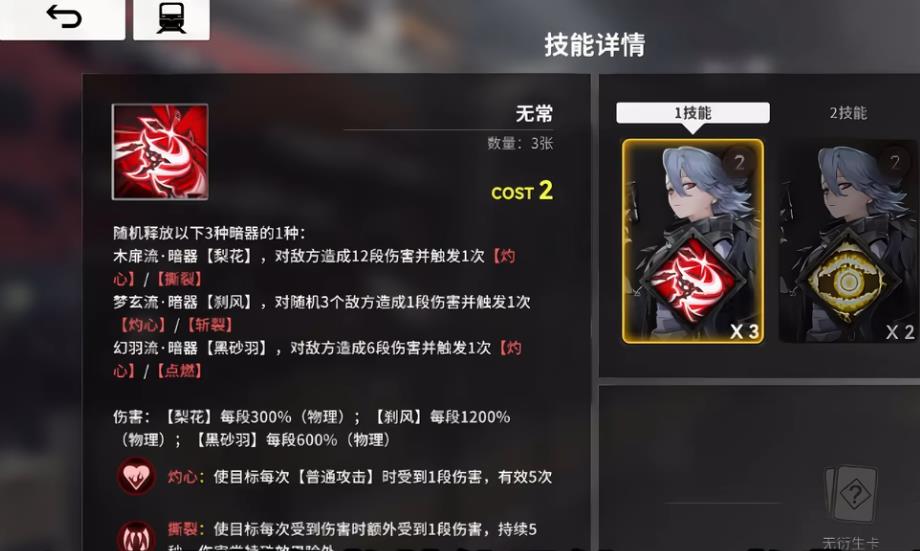 隼的二觉较为关键,当队伍使用队长技、得意技的时候,会直接打出一次无常。结合共振回费二觉的效果,就是当玩家打出任意的队长与得意技,都能回复一点费用。在当前回费效果较少稀缺的情况下,该能力还是比较厉害的,让隼拥有了上场的机会。因此在抽取的时候,要不就直接不抽跳过去,要不就抽个二觉等变强。