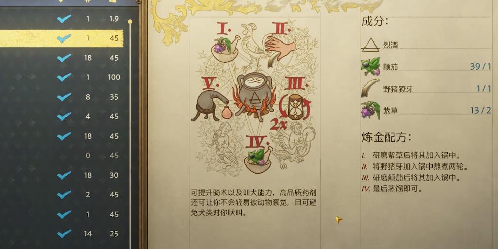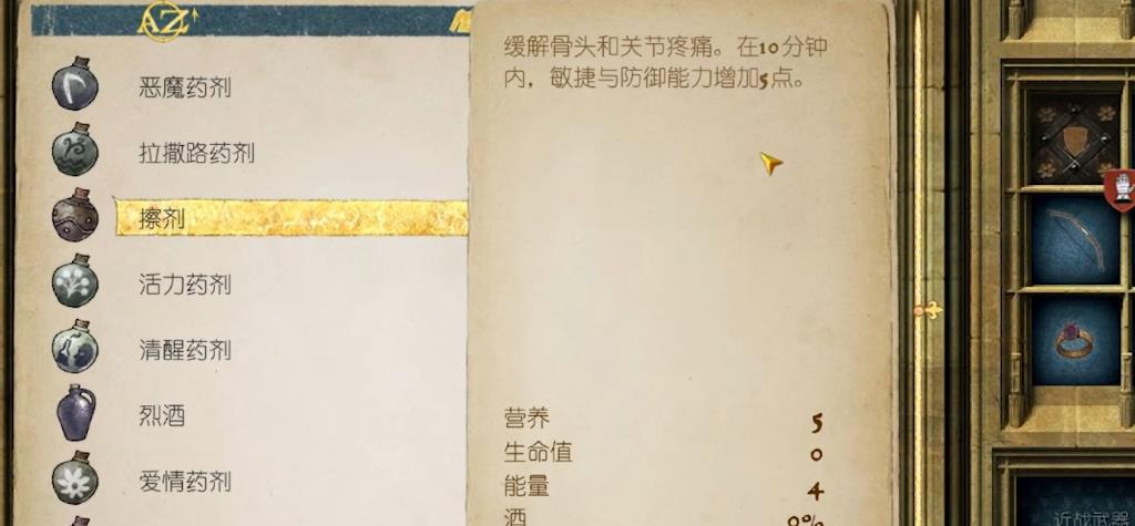 狐狸药剂是增加五点口才,可以提阅读速度,在顶级品质情况下增加50%经验获取。喝了该药剂以后,玩家就能直接通过口才检定,一小时就能读完一本书了。睡莲香水与雄狮姿态香水的作用类似,都是增加魅力值,前者持续时间更久,后者的数值更高。