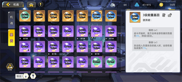 基因附带各种词条技能,词条分为一级二级三级。相同词条叠加可以强化词条技能,一级强化一点,二级强化两点。五级机魂较低概率能刷出专属的稀有词条技能,三级基因可以携带三级普通词条或者一级普通词条加一个稀有词条。