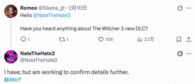 近日知名爆料人NateTheHate2回复网友提问时,确认了《巫师3》新DLC的存在。有玩家询问NateTheHate2:“你知道《巫师3》新DLC的消息么”,NateTheHate2回复称:“我知道,但我正在努力确认更多细节。”
