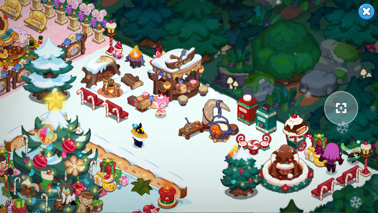 圣诞乐园的上半图是我们主题的重点,左边是我们烤火的地方,清清放了两个喜庆的红色凳子和一颗有雪顶的圣诞树,圣诞节日氛围就有了,旁边还有一个站立的糖糖地精在篝火旁边烤火,除此之外我还放了一个贩卖热饮的食品店,大雪纷飞的冬天小饼干们可以吃点热乎的东西,简直不要太好。右边是给饼干们安排的放松休闲场所,坐着红色旋转的糖果桌子和凳子,旁边有个吊着的火锅,饼干们可以一边烤火一边吃火锅。还有一个巧克力喷泉,特意为饼干们放了两个红色拐杖凳子,可以和自己小伙伴一起看喷泉赏雪景,旁边还有一个冰淇淋小车,冬天吃冰淇淋也是一种特别的体验。