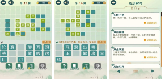 将传统填字逻辑与成语文化深度融合,每个关卡均设置明确的横纵线索提示,如“形容坚持不懈”“出自《论语》的四字短语”等,引导玩家从语义出发推导答案。操作上支持拼音首字母输入辅助,降低入门门槛;通关后获得积分可解锁新章节,全系列包含超千道原创题目,覆盖中小学课标常用成语库。
