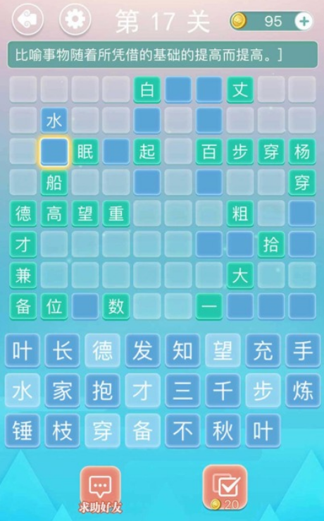 本作坚持“寓教于乐”设计理念,围绕汉语核心素养构建内容体系。关卡涵盖成语解析、古诗词填空、俗语补全等多种题型,难度梯度清晰,由浅入深。初始关卡常以纵横交错的字阵呈现,每组词语缺失1至2个关键汉字,玩家需结合语义逻辑与知识积累完成精准补全,有效锻炼语感与文字敏感度。