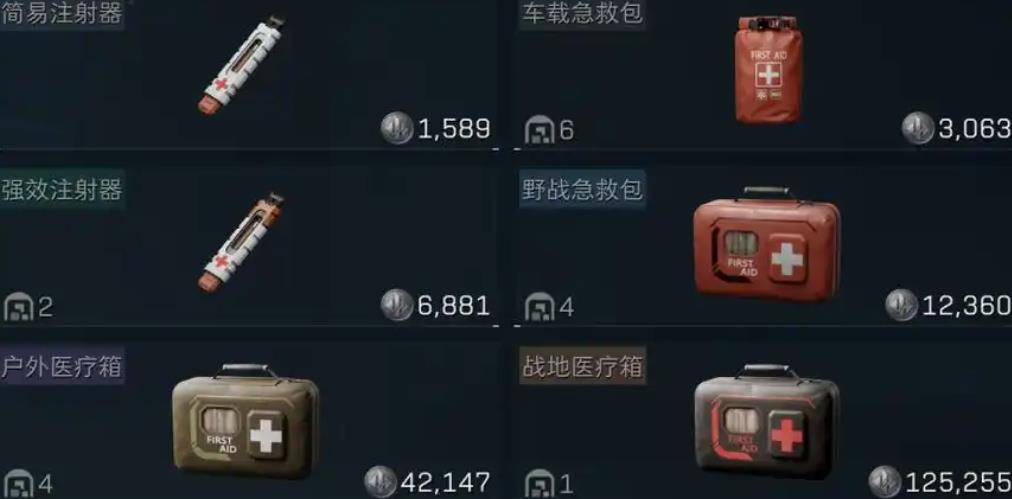 药品里最常见的是简易注射器,但是效用较差,售价为1593,每秒只能恢复5点血,不推荐携带。车载急救包的耐久度为90,启动时间为五秒,每秒恢复6点生命,因为治疗时间过长,不适用于快节奏的对战。在打药治疗的时候,队友可能早就已经流血死亡了,并不推荐使用。强效注射器启动时间短,为三秒,60点的耐久值也不算低,打药速度快,每秒恢复12点生命值,适合高压战斗场景。