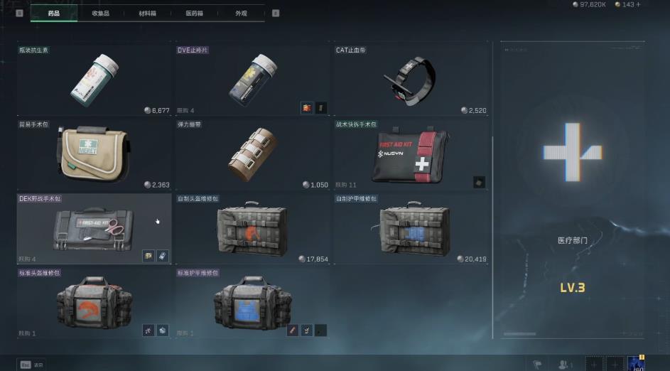 价格为7465金币,无论是普通机密还是绝密对局,都能看到许多玩家携带,强烈推荐新手使用。野战急救包尽管启动时间稍长,为六秒钟,但是性价比极高,1万5的价格即可获得220点高耐久的血包,推荐使用。当角色受到贯穿伤、骨折时需要通过治伤类手术包治疗,例如人物左臂同时存在骨折与伤口时,使用手术包可同时治愈这两处异常。
