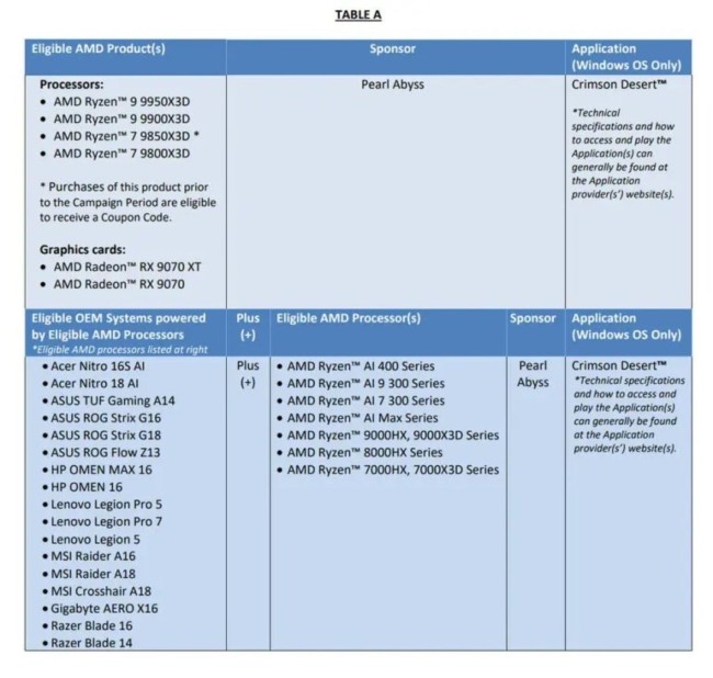 根据官方公布的活动细则,2月10日至4月25日期间,凡购买指定AMD锐龙处理器、镭龙显卡或搭载锐龙处理器笔记本的用户,均有机会获得《红色沙漠》数字版兑换码,赠品数量有限,送完即止。