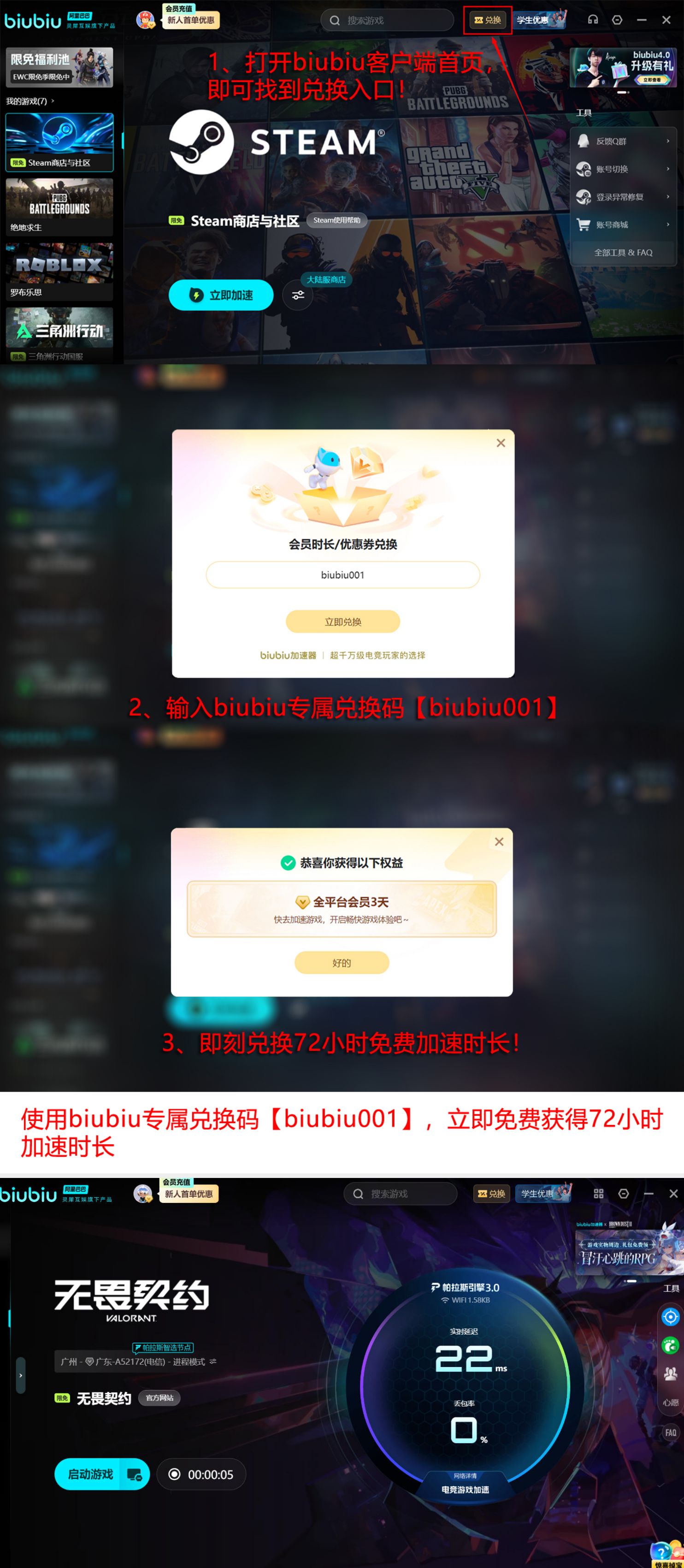 该加速器已通过职业赛事环境验证,被PUBG冠军选手小叮当列为日常训练指定工具。针对《无畏契约》客户端特性,其支持动态端口映射识别、跨平台协议兼容及切屏瞬态连接保活功能,可有效规避因系统焦点切换导致的Socket重置或心跳超时。当前新用户注册即可领取专属加速权益:输入口令【biubiu001】立即获得3天全功能免费使用权限;首登用户额外加赠24小时,累计可达96小时无限制加速体验,彻底消除切屏闪退隐患。