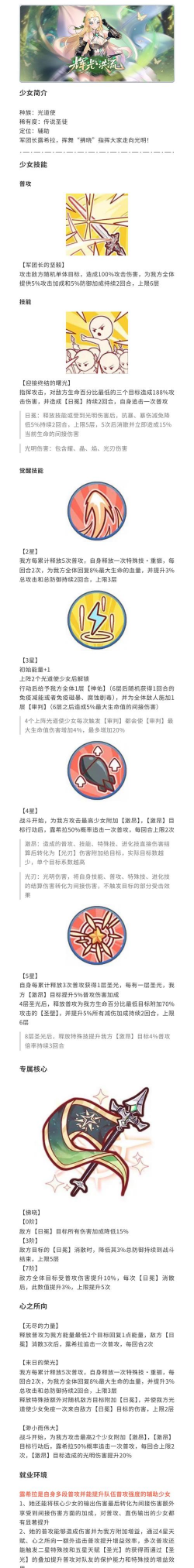 战斗开始,为我方攻击最高2个少女附加【激昂】,【激昂】目标行动后,露希拉50%概率追击一次普攻,每回合上限2次,【激昂】目标造成的光明伤害提升20%