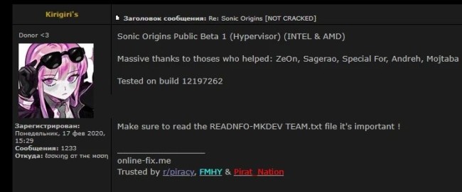 Kirigiri's使用的依旧是以虚拟机管理程序的方式攻破D加密,可在AMD与Inter处理器上运行。该黑客不知出于什么原因持续攻破世嘉及其索尼克系列游戏,这已经是近几个月来第四款索尼克游戏被攻破D加密了。