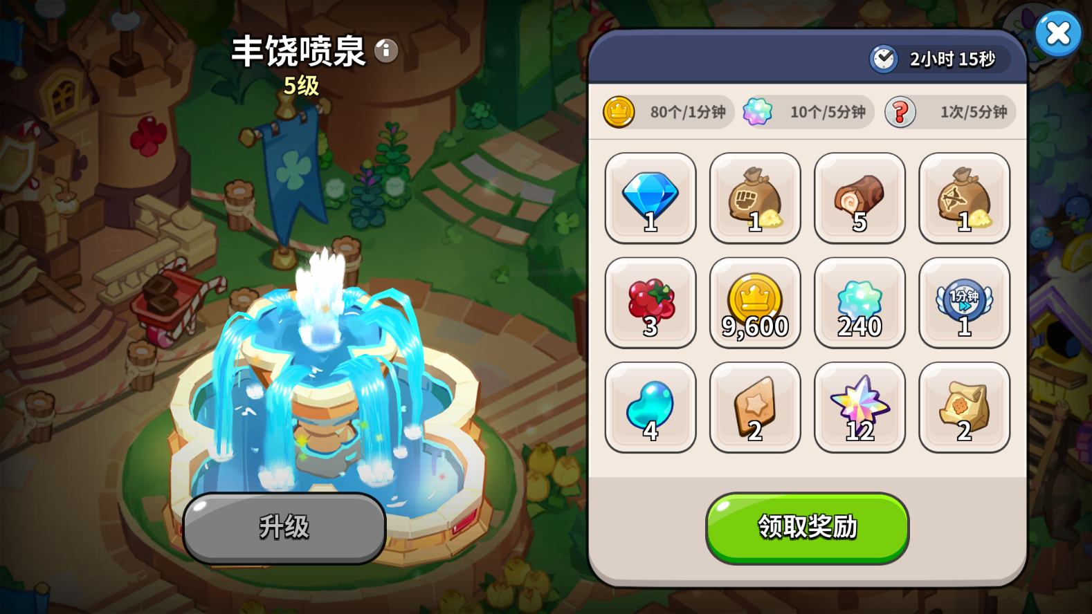 熊熊果冻列车、丰饶喷泉、许愿树奖励这些,都是我们日常能获得钻石的地方。属于可持续获取资源。但是不管是列车还是喷泉,都需要高一点的等级才能产出钻石。