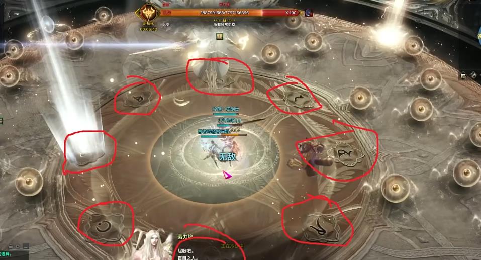 等天界的boss血量下降到60管血后,进入符文和分身的机制。每位玩家会被传入各自的里世界中,场地外围会出现若干词条,带有符文的三个子条以及三个分身。其中boss的三个分身中两假一真,每名玩家需要找出真身并打掉。每位玩家里世界中的符文和分身位置是不一样的,和符文重合的分身便是真身。玩家需要从12点开始,顺时针通过标记带有符文的紫色法阵,来告诉队友打哪一个。
