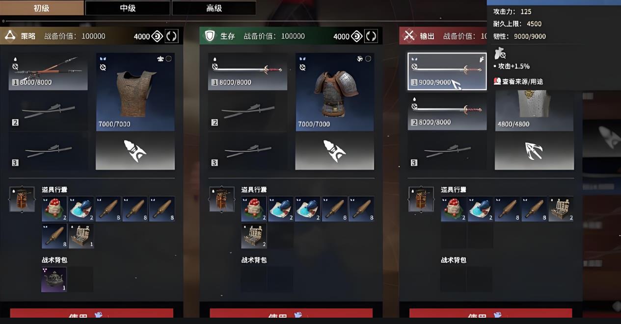 备战期间需要给角色进行配装,如果没有足够的日月金,或者仓库里面没有装备,就可以使用战备令。战备令分为蓝、紫、金等级,可兑换不同等级的武器和装备,且有初、中、高级之分。其兑换的套装仅在一局内生效,成功撤离后装备可作为奖励保留,被击败则装备消失。如果不想战前使用战备令,点击使用后可关闭,或直接返回并取消使用。一键修理的作用是提高武器耐久,基础维护为常规提升,加深则能进一步提高,例如从9000升到18000,两者均需消耗相应日月金。