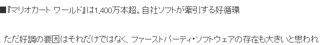 ·尽管目前任天堂自制游戏大作始终没有太多,单看《马里奥赛车:世界》销量超过1400万的普及率,凸显任天堂第一方软件的高效能力量。