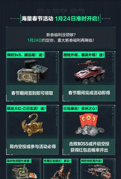 上面这些便是三角洲行动新春活动有哪些的说明。从目前的情报来看,整个游戏所给的福利还是十分不错的。基本上每一个活动都可以获取到不错的福利,大家可以根据自己的需求来决定活动的完成顺序。