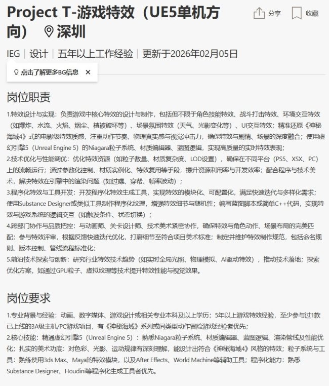 据岗位描述,《Project T》为一款UE5单机方向的3A级主机/PC游戏,目前正处于早期团队组建阶段。招聘信息中,特效、动画等岗位均要求“至少参与过1款已上线的3A级主机/PC游戏项目”,且明确“有《神秘海域》系列或同类型动作冒险游戏经验者优先”。