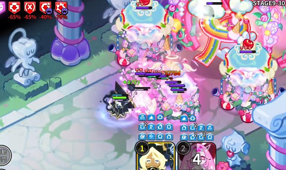 搭配宝物珠宝盒,效果是能对敌方范围施加负面被动,包括提升所受伤害、降低攻击力和暴击率,虽然可能牺牲莓果项链或勋章的效果,但整体压制力较强。不过该队伍存在被克制的可能,可将其中角色替换为带武士伤抗的黄金起司饼干来应对。在实战里当迷幻状态解除或被免疫后,敌方会进入懒散状态,普通饼干的冷却时间恢复速度、攻击速度及恢复量均会下降,其他单位则攻击速度和恢复量降低。