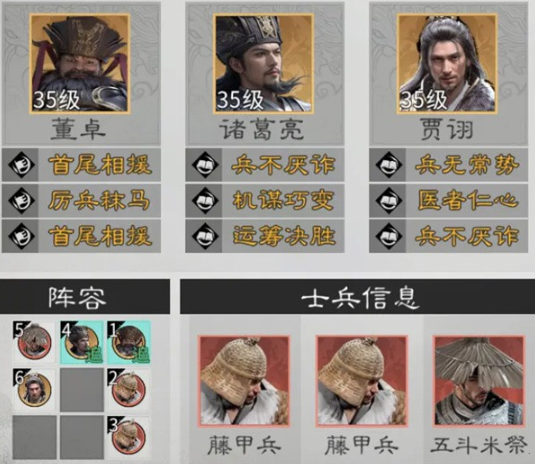前排携带2个藤甲兵吸收伤害,后排携带1个五斗米祭增加恢复能力。队伍依靠董卓和诸葛亮的控制效果触发贾诩的天赋追伤,造成大量伤害,对比携带吕蒙的贾诩控制队,输出能力更强,能够更快地击败敌军。队伍三个英雄都为绝世英雄,养成成本高,更适合大佬玩家。