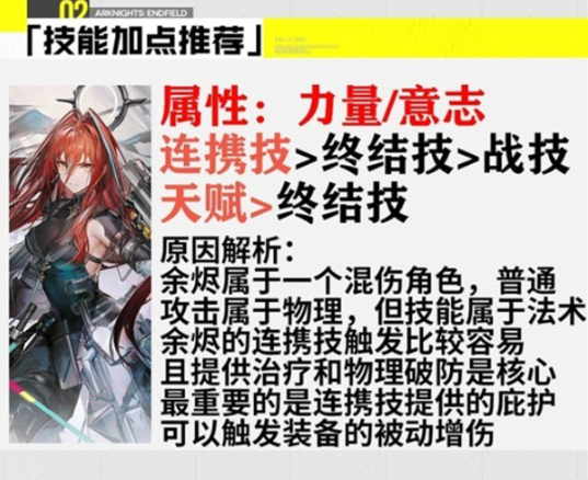 余烬属于混伤角色,普通攻击物理,技能为法术。她的连携技为核心技能,提供治疗、物理破防与庇护,可触发装备被动增伤。终结技与战技天赋则是辅助提升输出与生存。