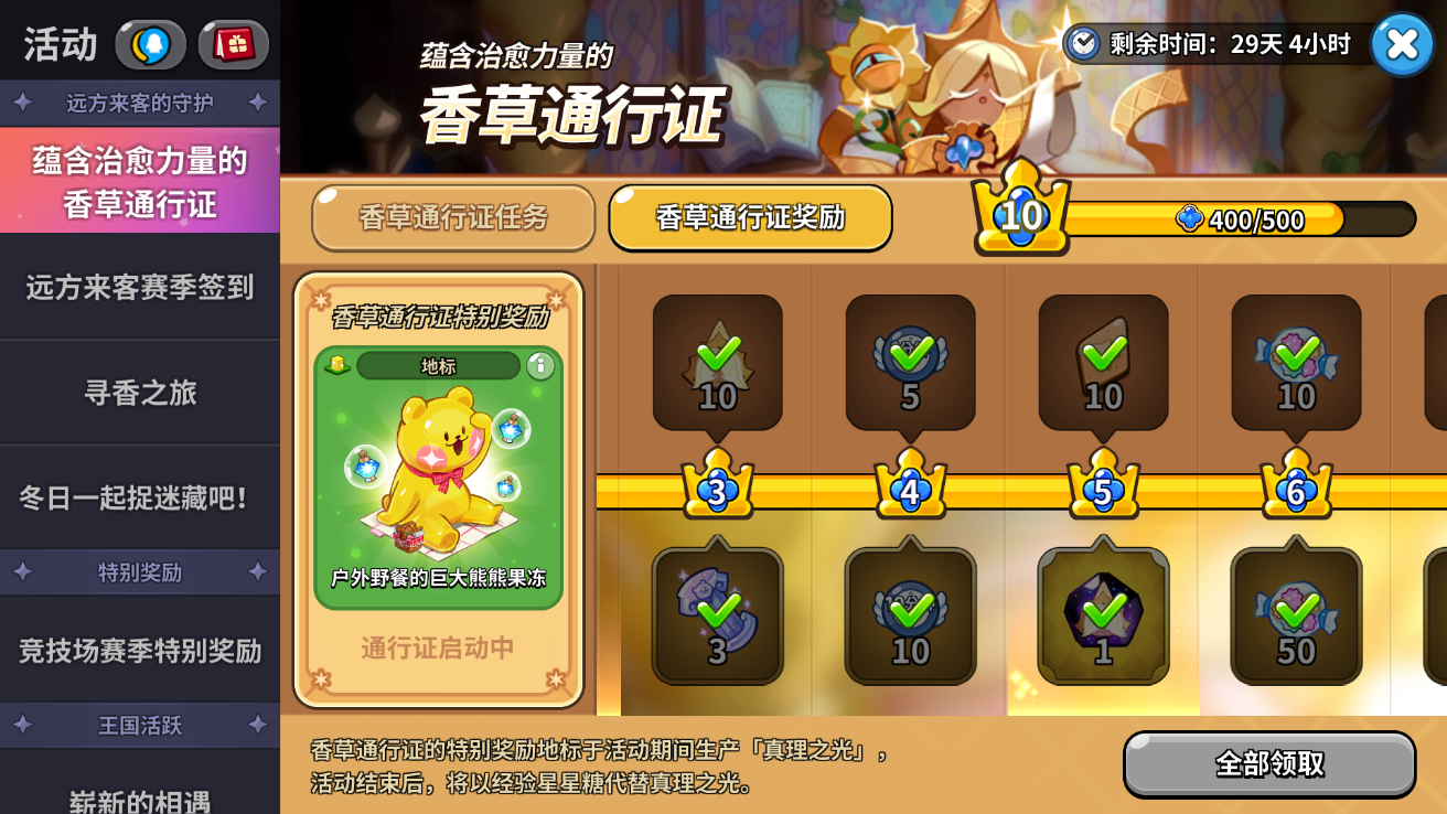 中氪玩家除了可以购买城堡升级礼包之外,还有一个香草通行证可以选择拿下。它是我们获得纯香草饼干的一种捷径。不仅地标可以产生大量真理之光,还可以领取纯香草饼干的灵魂石。纯香草饼干现在可是版本答案,想要冲竞技场名次的饼干玩家不要犹豫,直接冲这个通行证。