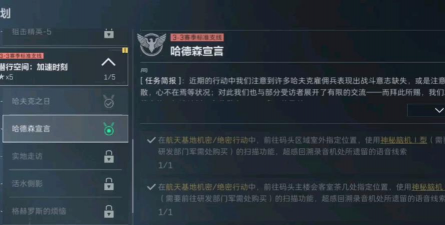 三角洲行动哈德森宣言属于赛季标准支线任务,需要在航天基地的机密或绝密行动中完成。任务奖励包括1950经验值、2个体能强化剂和25万哈夫币。该任务的核心在于使用特定道具超感回溯录音机遗留的语音线索。