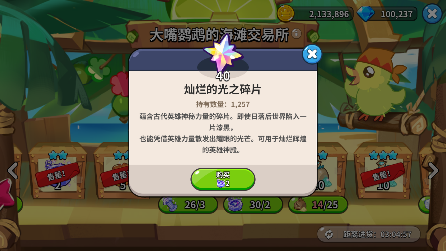 极光材料其中一种过多或者过少时可兑换平衡数量,地图碎片和焦糖望远镜建议提前兑换,后期探索快人一步。灿烂的光之碎片后期极光材料多再兑换,前期可无视。