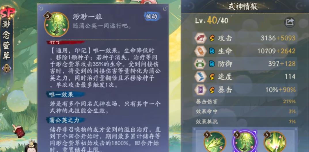萤草的三技能本身仅为群体单段伤害,加上蒲公英之力后可打出两段黄字伤害,同时还能附加群体治疗效果。每使用一次三技能,消耗该层数的系数就会提高,最高可达700%,且自身受到的间接伤害也能使该系数提高。在行动后长按普攻技能,在最下方即可看到当前剩余的蒲公英数量。在二技能满先机的时候,会给全体友方附加两颗种子,等回合结束后会给包括阴阳师在内的其他友方及自身都附加上。