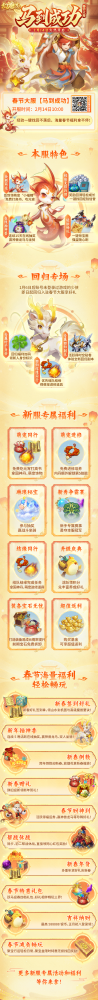 少侠入驻新服,即可体验新春签到、新春年货以及新年福运礼等一系列跃马迎春活动。参与活动不仅可以领寻宝币、高级魔兽要诀等好礼,还有机会赢取神兽龙马礼包、双人坐骑以及时装兑换券等珍稀道具。