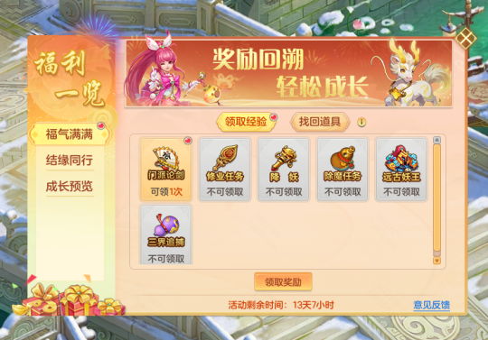 春节减负,轻松过节!少侠在活动期间上线即可领取近9天错过玩法的经验信誉,消耗聚宝盒还能找回错过玩法的道具奖励!
