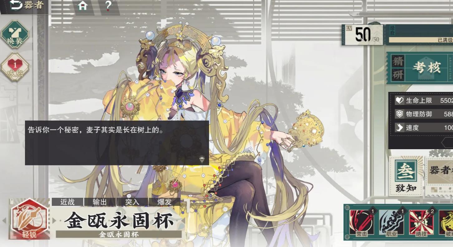 金瓯永固杯在焕彰后速度无提升,攻击力会提升500点,感闻技能名为团圆夜的灯笼。共有四个效果,在使用职业技后能获得一点能量,让处于金虹乍现状态的敌人获得20%额外易伤,即使不在她的回合也能生效。在攻击该状态的敌人并结算伤害时,会计入60%的额外伤害增伤,由于额外伤害必须通过金虹状态来实现,相当于常驻的60%额外伤害增伤。