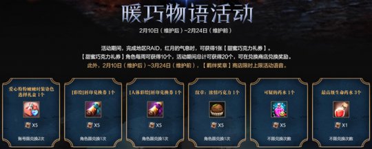 2月10日维护后,暖巧物语活动”开启,活动期间完成指定战役,可获得1张甜蜜巧克力礼券”,礼券可以兑换到各种甜蜜道具!
