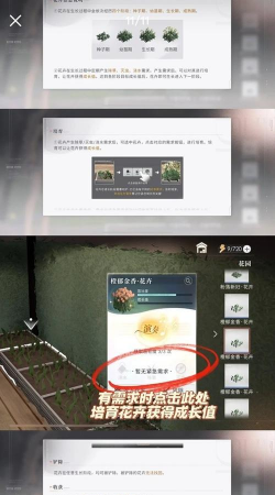 花卉种植攻略。种植花卉一共有四个阶段,成熟期结束可以收获,花卉成长过程中会出现需求(不同花卉分别可能有三个时间会有需求),当花卉出现需求时右上角会有消息提示你需要进行培育,前往花卉处点击完成培育,会增加他的成长值,越早培育增加的成长值越高(最高在24小时内完成培育一次提升20成长值)