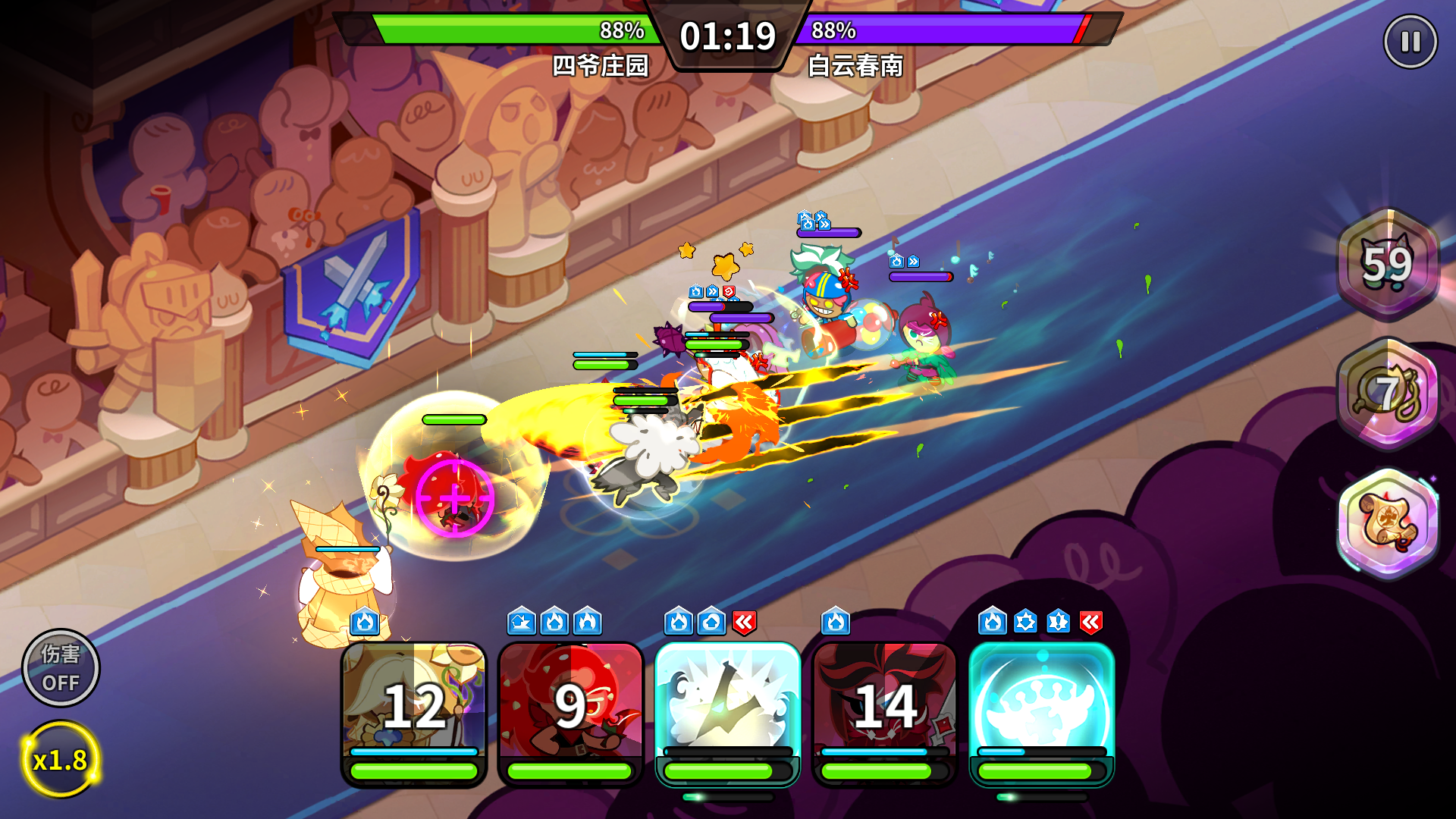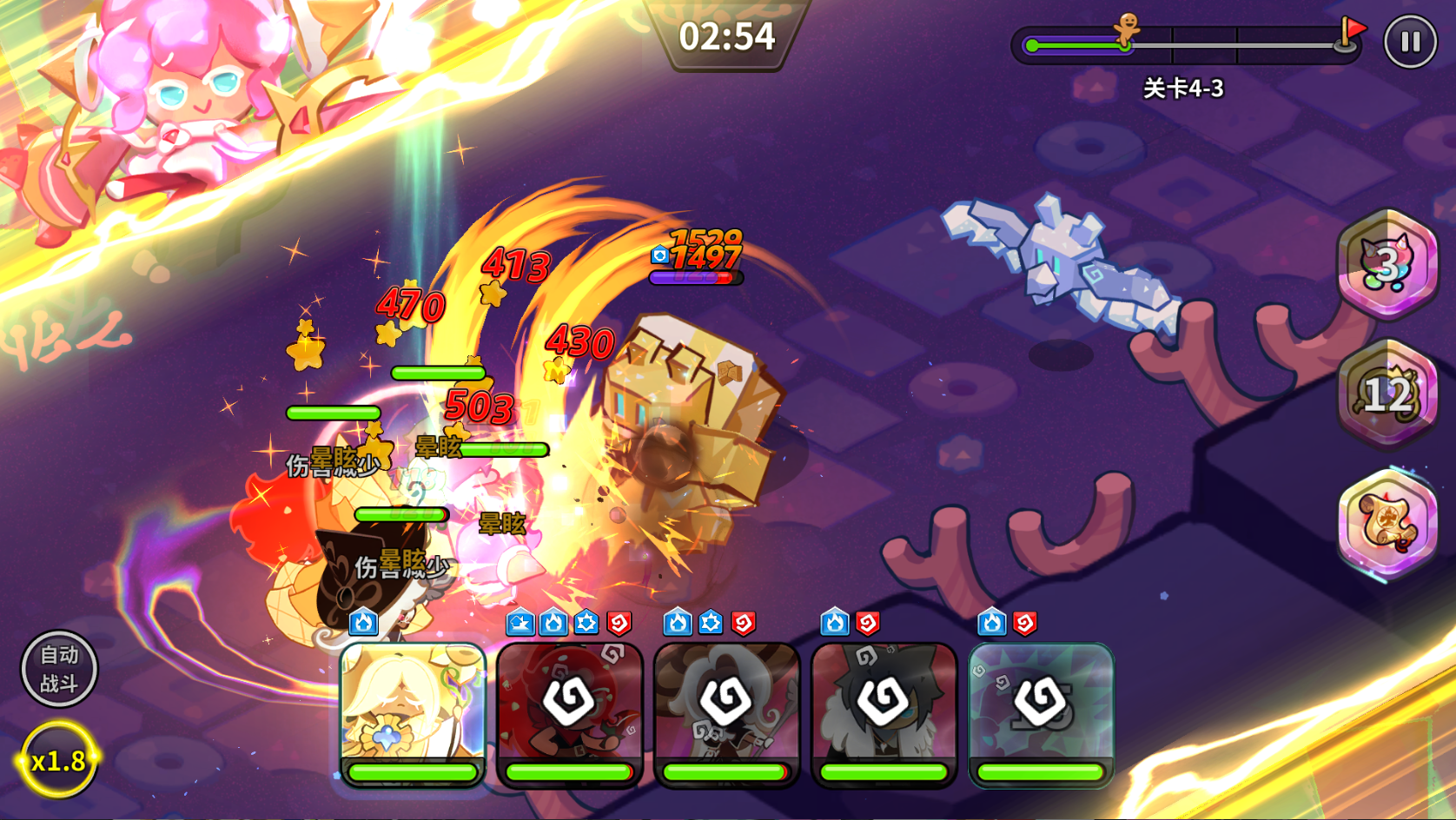 配料优先推荐5伤害减免,尤其是单前排时用伤害减免配料更加稳定。如果掉血不多或者有比较强力的恢复型饼干,也可以带5攻击加速推图速度。