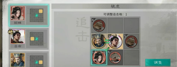 英雄站位:貂蝉不站追击格,吕布站貂蝉的追击格,并与荀彧互站追击格。
