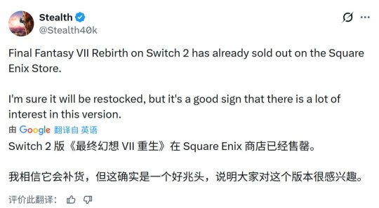 推主Stealth40k发帖表示,《最终幻想7:重生》Switch2移植版虽然仅仅公布了三天,但在美国SquareEnix商店已经售罄。截至发稿时,英国商店仍有库存,但看起来也很快就会售罄。