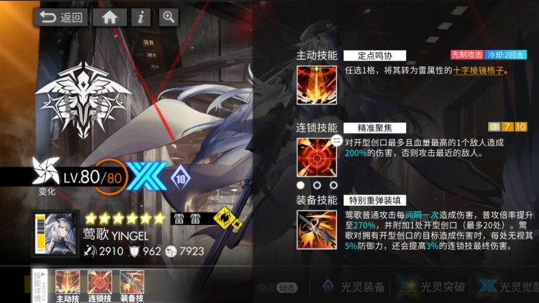 莺歌的连锁技是对创口最多且血量最高的一个目标造成百分之两百三十多倍率的伤害,不然攻击距离自身最近的敌人,主动技能是任意选择一格将其转化为雷属性的十字棱镜格子,队伍连线时将十字棱形镜格子附近十字形四格转化为跟十字棱镜格子一样的属性,该技能提供了一个新机制,就是十字棱镜格跟其它棱镜格相同,跟其延伸出的周围四格不会影响轴的后续排序。