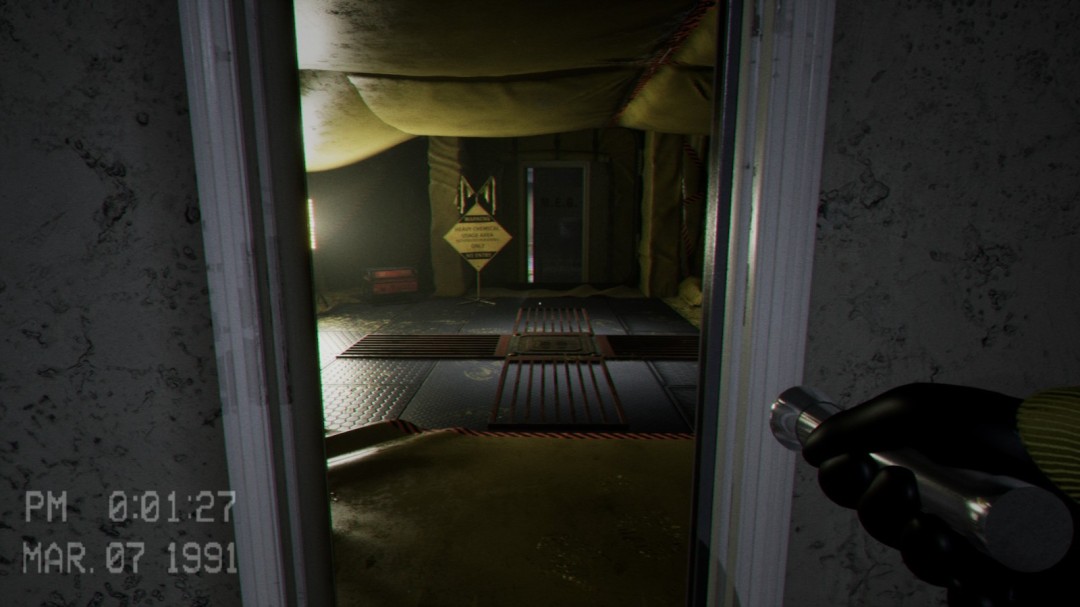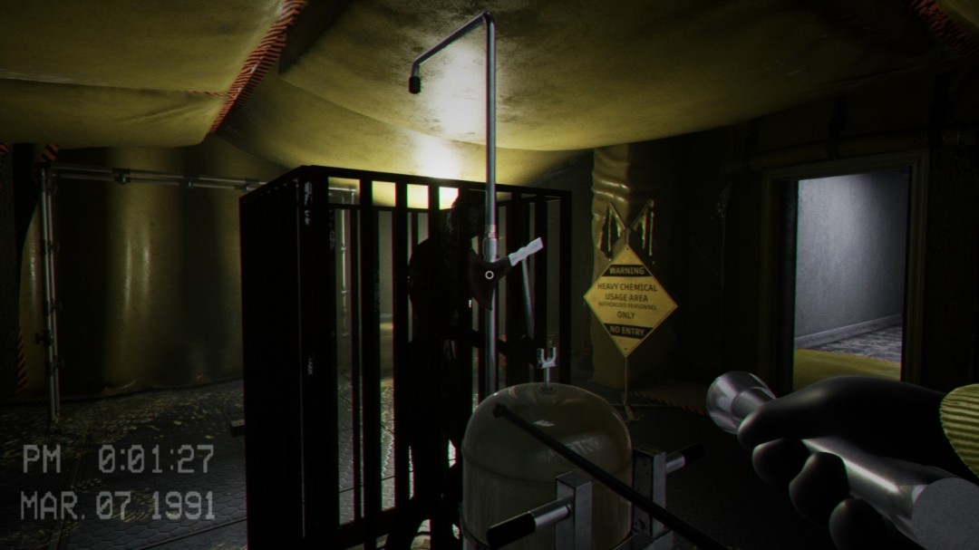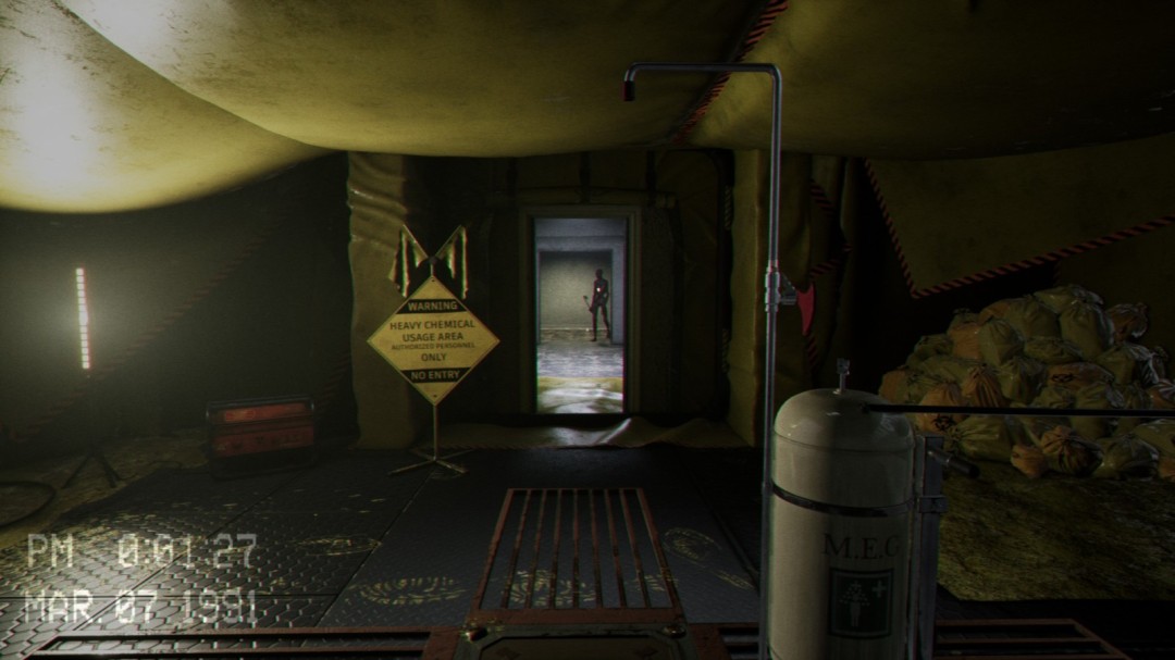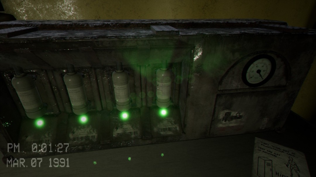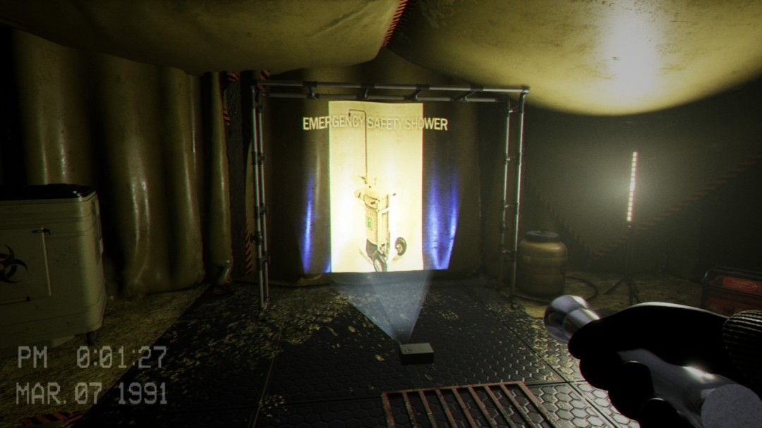 来到地下室后进入到这个房间,右边有一台机器,左边会播放一段影像,告诉你右边的机器怎么使用,这里必须等影像播放完毕之后门才会开启,可以在播放影像的这段时间将右边的罐子推过来。