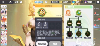 第2种转职职业则是光明游侠,光明游侠本身也是属于猎人系的路线,转职后提高的是攻击力以及物理防御加成,在转折后拥有着一个核心效果,就是在触发暴击之后,会直接追击敌人,是非常出色的反制能力,并且这个机制是不需要叠加层数的,转职成功后,他本身也会拥有着非常显著的物理防御,让他的持续作战有了更强势的表现。