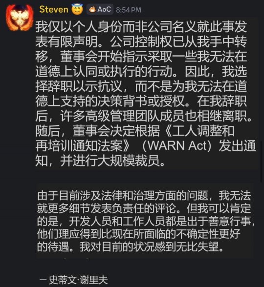 危机的开端是多名IntrepidStudios员工在linkedIn上发布求职贴。其中,前通讯总监玛格丽特·克罗恩证实:所有人都被解雇了。这太糟糕了。”随后,公司创始人兼《创世灰烬》创意总监史蒂文·谢里夫在游戏社区上发布声明,称公司的控制权已从他手中转移,董事会采取了其在道德上无法同意或执行”的行动,因此他选择辞职抗议。其离职引发了核心领导团队的集体出走,董事会随后决定依据《WARN法案》启动大规模裁员。