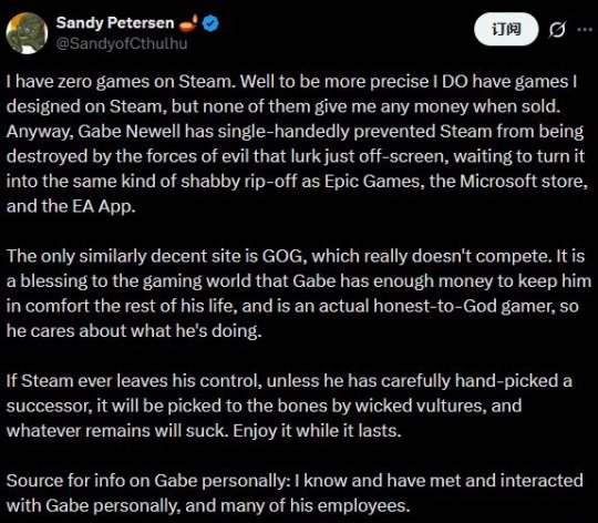 Petersen表示:Gabe几乎是凭一己之力,阻止了Steam被那些潜伏在阴影中、随时准备下手的恶意力量摧毁。若不是他,Steam恐怕早已沦为像EpicGames商店、微软商店或EA App那样廉价又坑人的平台。目前唯一还能保持体面的只有GOG,但它实际上并未形成真正的竞争。”