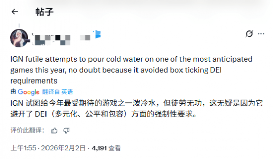 也有玩家认为:IGN徒劳地试图给今年最受期待的游戏之一泼冷水,毫无疑问,是因为它没有去迎合那套打勾式的DEI要求。”