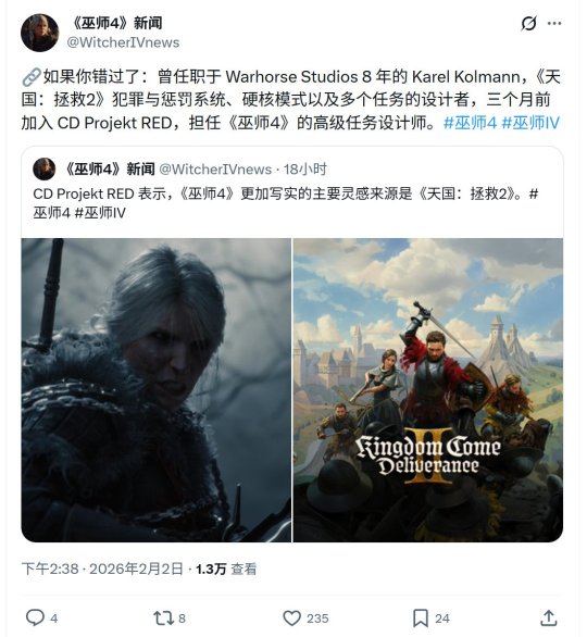 有趣的是,《天国:拯救2》首席玩法设计师Karel Kolmann于去年11月加盟了同样是波兰游戏开发商的CDPR。