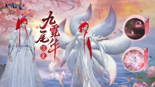 九尾狐主题外观【浮光·九尾霓华】于青龙秘宝上线。同系列动作、脚印一同奉上。听闻世人皆爱这霓华皮相,九尾狐应时而来,予少侠一场浮光美梦~