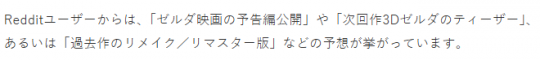 ·玩家太乱的几个策划包括公开塞尔达电影的新预告?”、全新3D塞尔达大作的预告?”、经典塞尔达游戏的重制版?”等等。
