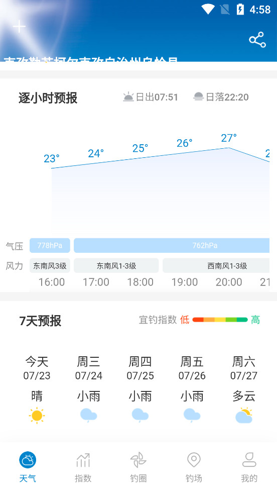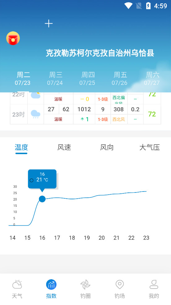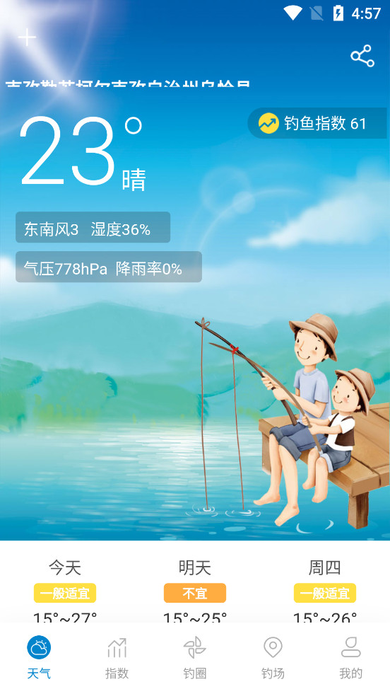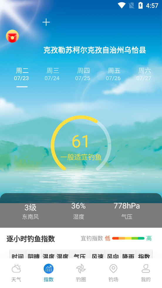 【钓鱼天气】提供实时准确与钓鱼密切相关的天气指数、帮你优化选择最佳钓鱼时机;