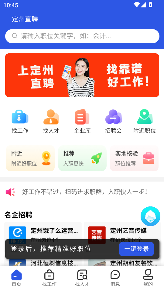 《定州直聘》是定州本地专业的招聘求职平台,专注为企业和求职者提供高效、便捷的岗位对接服务。APP涵盖海量本地职位信息,支持一键投递、在线沟通、智能推荐等功能,助力企业快速招人,求职者轻松找工作,打造定州人自己的求职招聘首选平台。