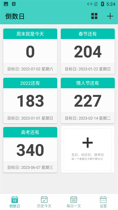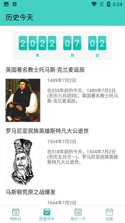 白大树倒数日计时是为大家提供的倒数计时服务的软件,可以一键查看重要的日子,在不同的场景中的使用需求都可以满足到,支持查看历史今天,增长自己的见识。