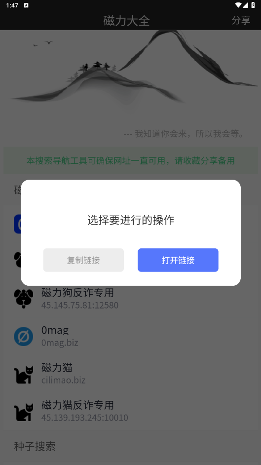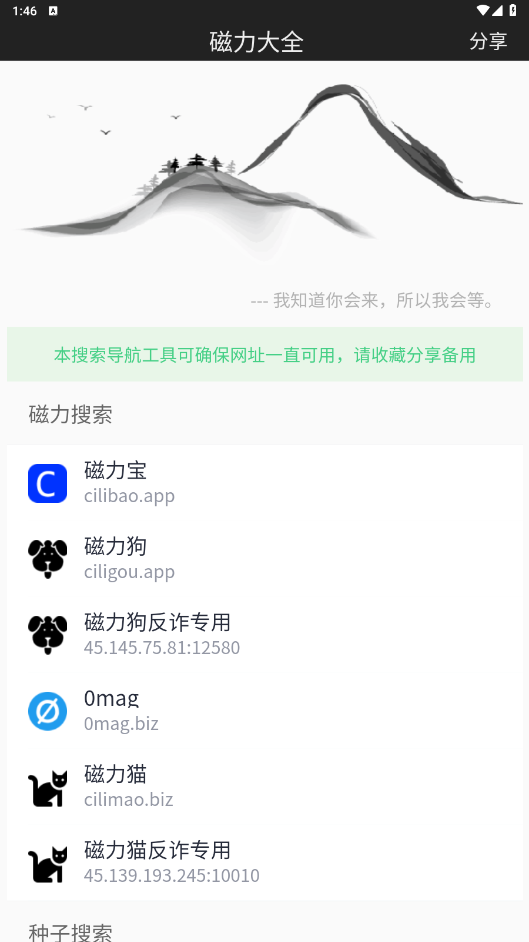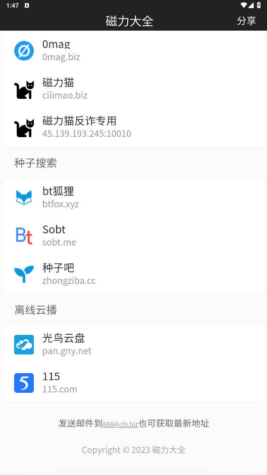 聚合多个磁力工具:磁力大全APP聚合了多个磁力工具,包括磁力云、磁力吧、磁力搜等,用户可以直接进入需要的磁力工具进行搜索。