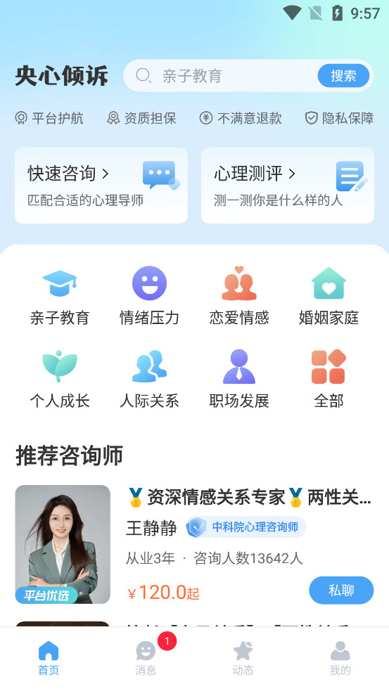 奥运冠军代言,cctv央视展播3A级专业心理咨询倾诉平台,央心倾诉心理咨询APP是一款专业的在线咨询app,致力于为用户提供便捷、专业、私密的咨询服务。它整合了业界知名心理导师等专业资源,覆盖了人际关系、职业发展、情感婚姻等多个领域,通过智能匹配技术,为用户量身定制心理辅导方案,让每个人都能找到适合自己的咨询支持。