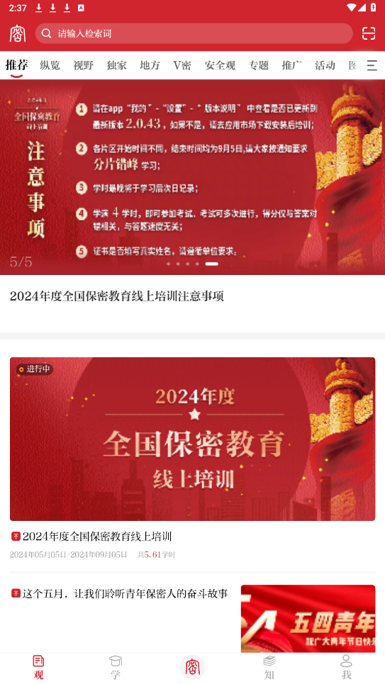 进入系统,点击“课程”开始学习。课程内容包含保密优良传统、保密法律法规、保密知识常识、保密技术防范和保密警示案例5部分,分为视频和音频两种形式。其中,标注“必修”字样的课程,是必须学习的内容。