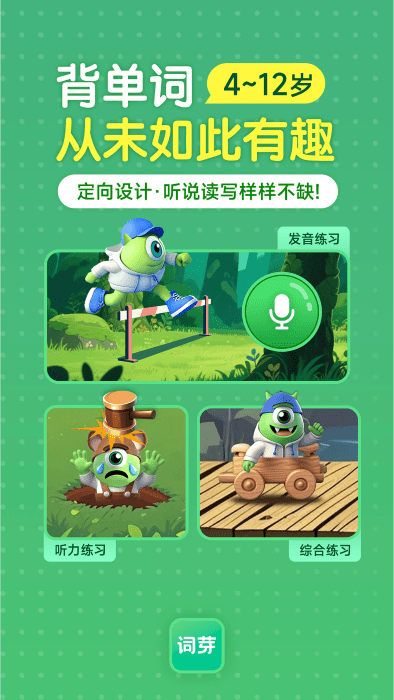 词芽单词app是一个小学的英语单词练习软件,不用再这里死记硬背,只需要完成几分钟就能认识单词,轻松的学习过程,让孩子爱上英语,还能直接的根据口语来练习,直接下载安装使用吧,让你的小孩每天主动背单词,快来下载使用吧!